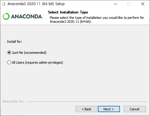 여기서 Add Anaconda3 to my PATH environment variable은 체크 해제 그리고 Register Anaconda3 as my default Python 3.8은 체크해줍니다.
