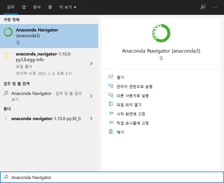 시작 프로그램에도 추가가 돼있을 거고 저처럼 윈도우 검색창에 Anaconda Navigator 검색하셔도 뜰 겁니다. 이제 설치된 프로그램을 실행해줍니다.