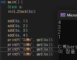 짠! 요런 느낌이죠 이제 메인함수에서 구현된 스택이 올바르게 작동하는지도 확인해 볼까요?