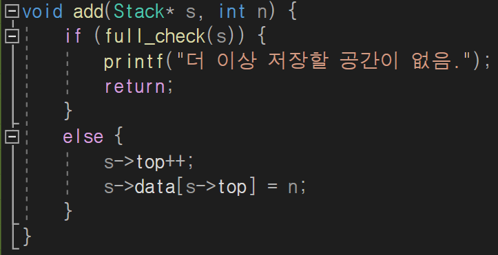스택에 데이터를 추가하기 전에 먼저 체크해야 될 것이 있죠. 바로 스택이 꽉 찼는지 먼저 확인을 해야 합니다!