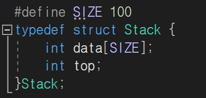 스택의 본체인 구조체 부분은 원하는 데이터 타입의 배열과 현재 데이터의 위치를 저장해 줄 변수 이렇게 두 개로 구성되어 있습니다. 먼저 저는 간단하게 int 타입 100칸짜리 배열 스택으로 가보겠습니다. 다음 단계로는