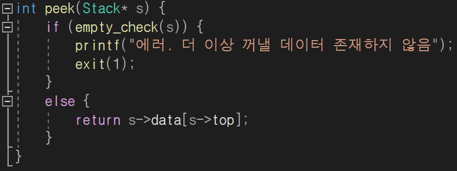 만들어둔 empty_check 함수를 이용하여 확인하는데 이번에는 스택이 공백 상태라면 함수를 종료시키는 것이 아니라 프로그램을 종료시킵니다. 리턴 값이 있는 함수 이기 때문에 없는데도 무언가를 뱉어낼 수는 없기 때문이죠.