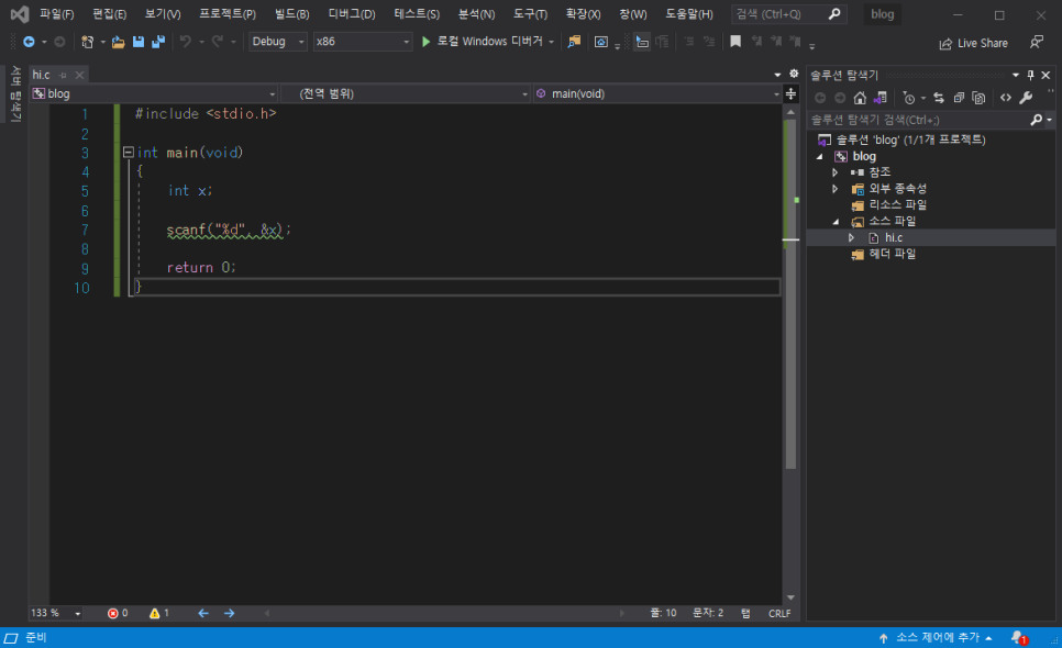 2번과 비슷하게 이것도 코드의 맨 앞줄에 #pragma warning(disable:4996)를 적어두면 scanf 오류가 사라집니다. 2번과 3번 어차피 비슷한 방식인데 2번을 외워두시는 거 추천드려요.