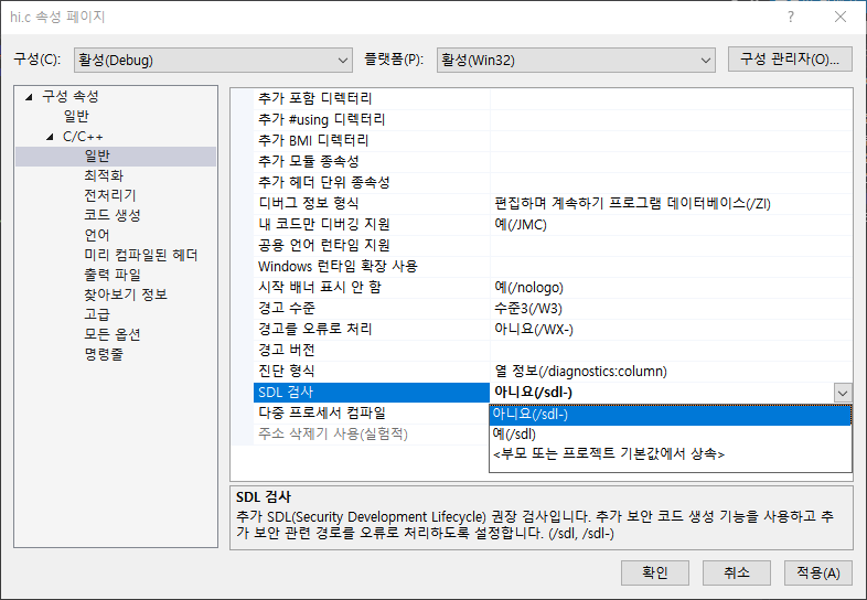 여기서 SDL 검사를 아니요로 바꿔준 후