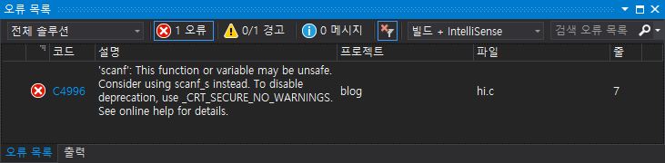 이게 무슨 소리냐면 scanf가 안전하지 않으므로 scanf_s를 쓰거나 _CRT_SECURE_NO_WARNINGS를 이용하라고 합니다.