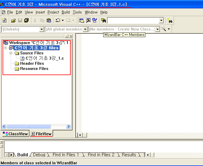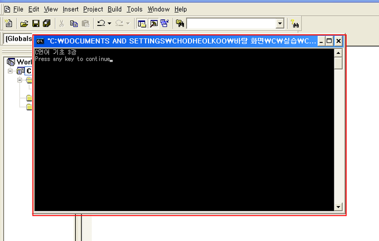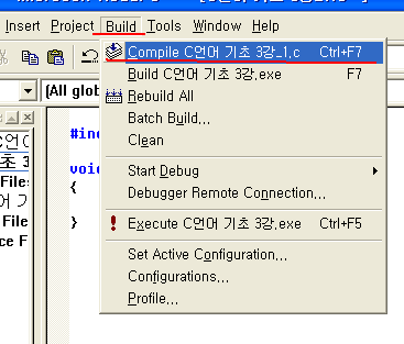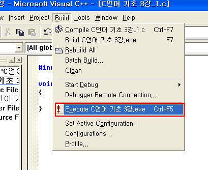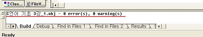 자 이제 3번과정인 링크는 컴파일 바로 아래에 Build C언어 기초 3강 exe가 보일겁니다.