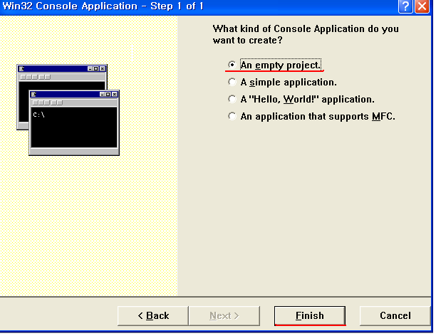 Win32 Console Application은 도스창띄워서 실행시키겠다~ 라고 생각하시면 되실꺼예요.