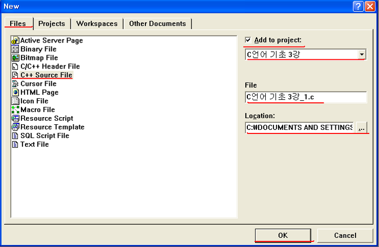 이번에는 File 탭의 C++소스 파일과 Add to project 에 체크박스 해주시고 만들어지는 파일이 포함될 project를 선택해 주시면 됩니다.